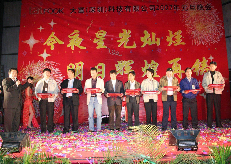 2006年12月31日18:30分,大富(深圳)科技有限公司2007年元旦文艺晚会暨2006年度颁奖典礼——“今夜星光灿烂,明日辉煌再铸”在大 富新工模车间隆重上演。孙尚传总裁、胡青副总以及各部门总监、经理纷纷来到现场,与全体员工欢聚一堂,兴致勃勃地观看了整场晚会。