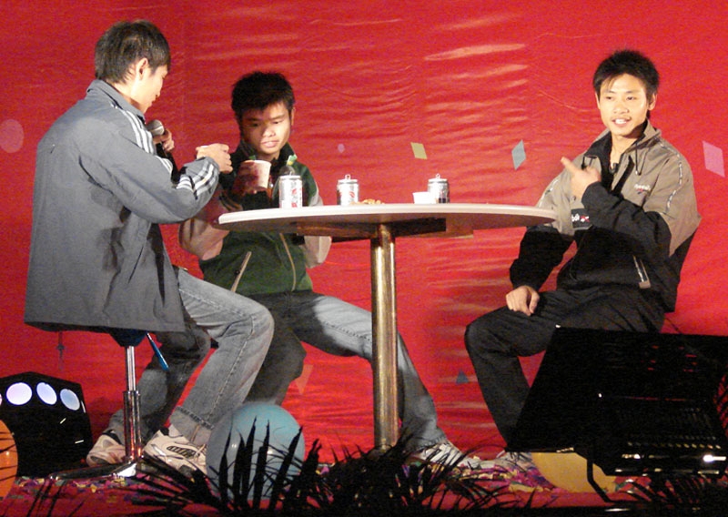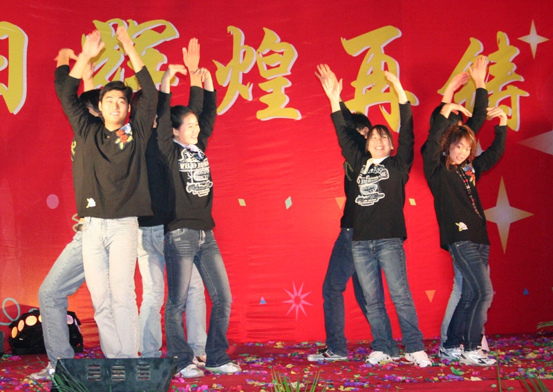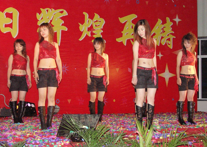 晚会在充满喜庆和欢乐气氛的开场舞《开门红》中拉开了帷幕。来自公司舞蹈队的6位队员以其俏皮可爱的装束、灵活的身姿、精彩的舞步,在舞台灯光的辉映下赢 得台下观众的声声高呼。由机加生产部表演的吉他伴唱《真的爱你》、相声《两个弄潮儿》、小品《打工心声》、《MSDS》、《过河》以及哑剧《理发》,由电 镀部表演的歌伴舞《肉麻情歌》、民族舞蹈《七月火把节》,由电子装配部表演的丑角戏、大合唱《明天会更好》更是博得观众阵阵喝彩。坐在后排的观众更是集体 起立,高举本部门标示牌大喊“加油”“加油”,令全场观众兴致高昂。而来自各部门联袂演出的各式舞蹈和小组联唱,如韩舞、现代舞、街舞、霹雳舞、“大富超 级女生”等,同样引起全场的热烈掌声。