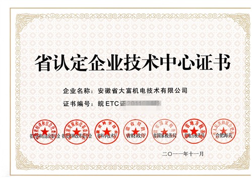 近日,经安徽省经济和信息化委员会、省发展和改革委员会、省科学技术厅、省财政厅等七家政府部门联合审定,安徽省大富机电技术有限公司技术中心被认定为安徽省省级企业技术中心。